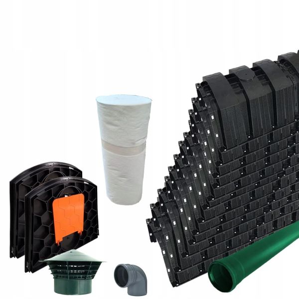 - Zawartość zestawu: 12 tuneli, 2 pokrywy, rura DN 110 o długości 1 m, wywiewka DN 110, kolano DN 110 90 stopni, włóknina szerokości 1 m o długości 17 m