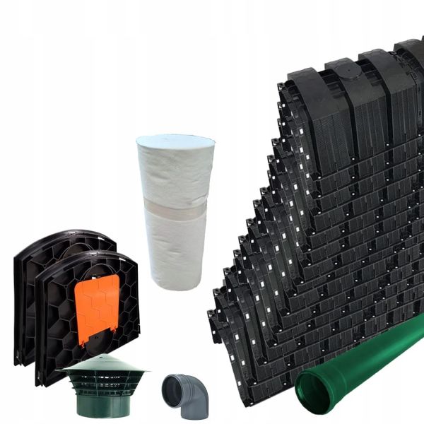 - Elementy zestawu: 14 tuneli, 2 pokrywy, rura DN 110 o długości 1 m, wywiewka DN 110, kolano DN 110 90°, włóknina o szerokości 1 m i długości 20 m