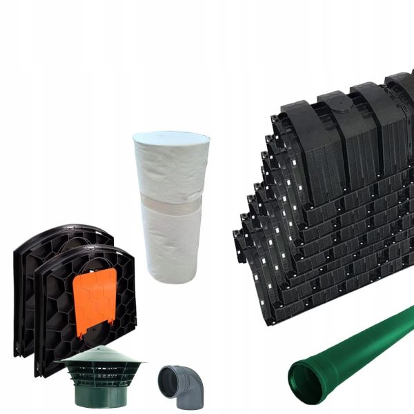 - zestaw zawiera: 8 tuneli, 2 pokrywy, 1 rurę DN 110 o długości 1 m, 1 wywiewkę DN 110, 1 kolano DN 110 90°, włókninę o szerokości 1 m i długości 11,5 m,