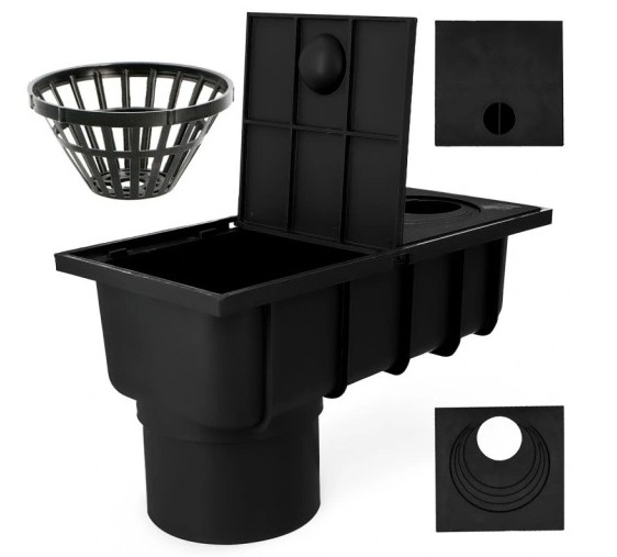 • Posiada standardowy dolny odpływ o średnicy 110 mm, co gwarantuje kompatybilność z typowymi systemami rynnowymi.