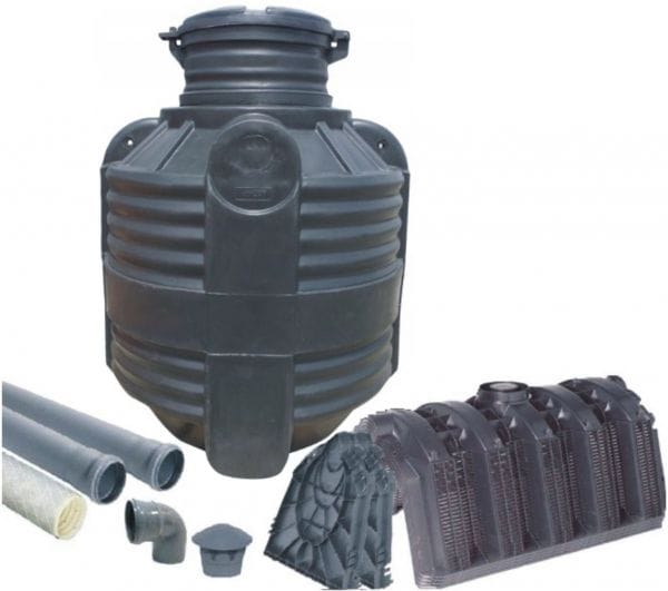 - Kompletny zestaw składający się ze zbiornika, kosza filtracyjnego, materiału filtrującego oraz tuneli rozsączających.