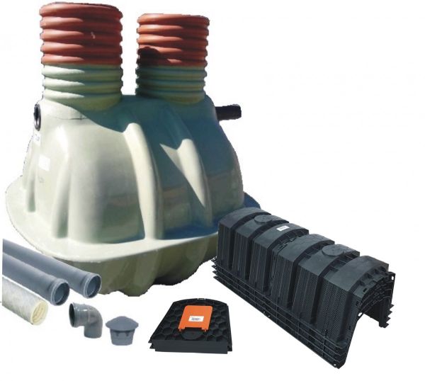 - Kompletny zestaw zawierający trzykomorowy zbiornik, tunele, rury, geowłókninę, kominek napowietrzający oraz biopreparat.