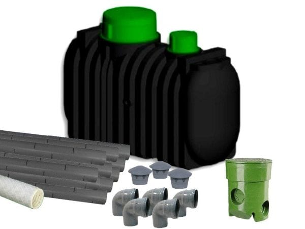 - Elementy w zestawie: zbiornik, nadbudowy, włazy fi 600 mm i fi 300 mm, pokrywy, studzienka rozdzielająca, rury drenażowe, geowłóknina, kolanka, wywiewki