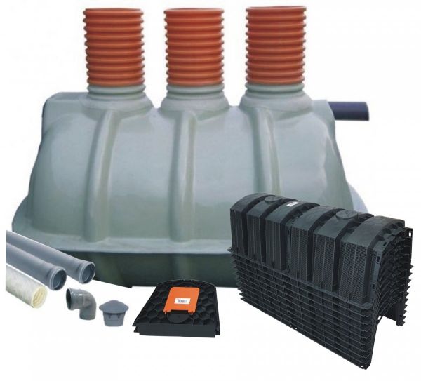 - Kompletny zestaw zawierający zbiornik, tunele, rury, kominek napowietrzający i biopreparat.