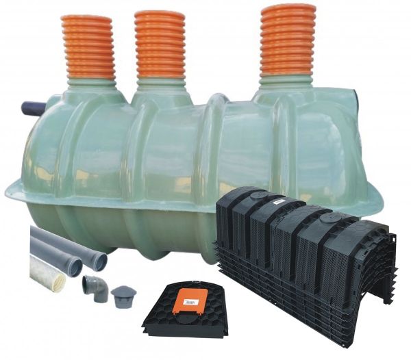 - Zawartość zestawu: zbiornik, tunele, rury pełne fi 110, kolano 90°, geowłóknina, kominek napowietrzający, biopreparat