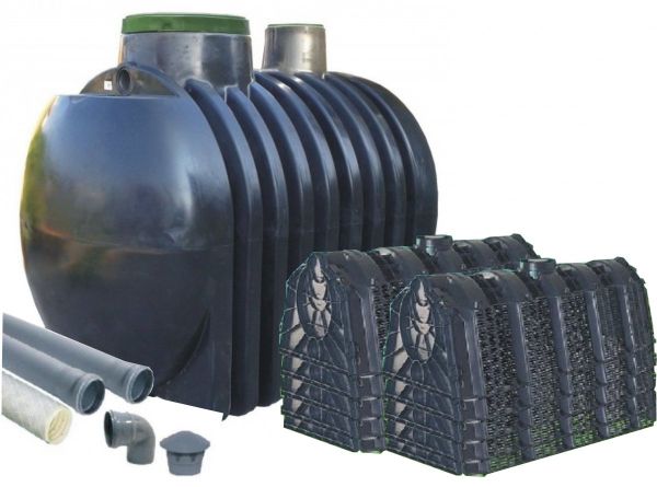 - Kompletny zestaw zawierający zbiornik, kosz filtracyjny, tunele rozsączające, geowłókninę i biopreparat.
