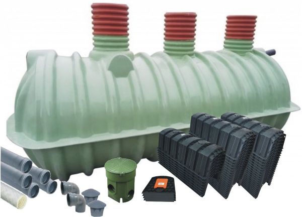 - Kompletny zestaw gotowy do montażu, zawierający zbiornik, tunele, rury oraz akcesoria montażowe.