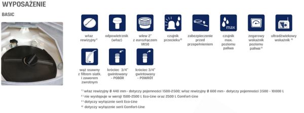 • Wyposażenie podstawowe: właz rewizyjny, odpowietrznik, wlew 2” z eurozłączem, czujnik przecieku, zabezpieczenie przed przepełnieniem, czujnik poziomu paliwa