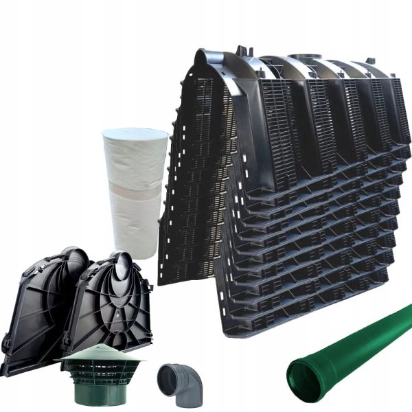 - Kompletny zestaw zawiera niezbędne elementy uzupełniające jak rury, kolano, pokrywy i włókninę