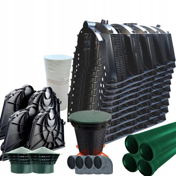 - wyposażenie zestawu: 4 pokrywy zamykające, 1 studzienka rozdzielcza, 4 rury DN 110 o długości 1 mb, 4 kolana DN 110 90°, 2 wywiewki DN 110, 14 mb włókniny o szerokości 1,5 m,